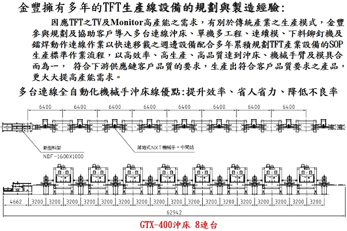 金豐於2001年參與國內(nèi)第一條TFT產(chǎn)業(yè)110 TON ×6連臺配合機械手臂生產(chǎn),為同業(yè)最先最早自動化生產(chǎn)系統(tǒng)。
